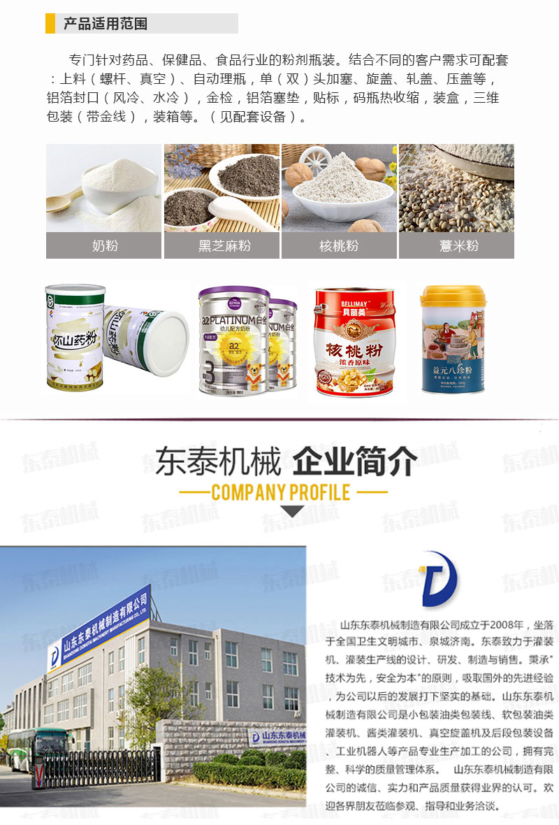 全自動(dòng)粉劑灌裝機(jī)適用于包裝粉末及小顆粒物料,如粉劑、小顆粒劑藥品、獸藥、葡萄糖、調(diào)味品、固體飲料、碳粉、爽身粉、農(nóng)藥等。