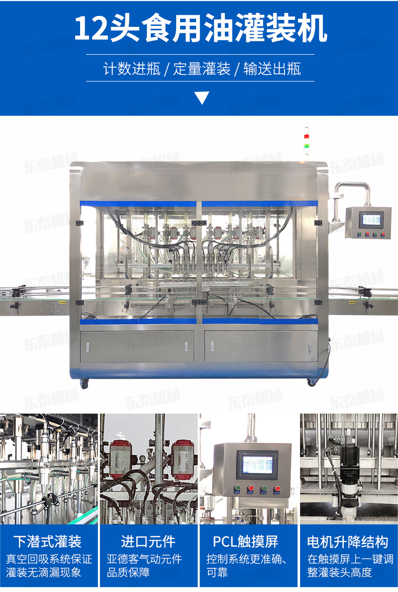 該系列灌裝機(jī)采用容積式計(jì)量灌裝原理,適用于各種規(guī)(100ml-1000ml)的南瓜籽油、榛子油、牡丹籽油、芝麻油、核桃油、山茶油、亞麻籽油、棉籽油、橄欖油、大豆油、玉米油、菜籽油等食用油灌裝。設(shè)備采用伺服驅(qū)動(dòng)活塞計(jì)量,保證了 1‰的灌裝精度,在保證灌裝精度的同時(shí),提高了 20%-35%灌裝速度,操作簡(jiǎn)單,維護(hù)方便,節(jié)省人工成本,生產(chǎn)效率更高。