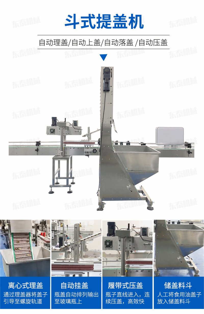 該提蓋式主要適用于制藥、食品、化工、日化等行業(yè),是自動(dòng)化生產(chǎn)線中旋蓋機(jī)、壓蓋機(jī)等的理想配套設(shè)備。采用底部添蓋替代傳統(tǒng)的手動(dòng)上蓋,使自動(dòng)化工作更加方便、快捷。特別是對(duì)于要求不能有磨損的瓶蓋如印刷好后的蓋子需要到下一步工序生產(chǎn)或者包裝等,此設(shè)備也可強(qiáng)有效的減少磨損;其工作原理是通過微動(dòng)開關(guān)檢測(cè)的作用,通過輸送刮板,把料斗里的瓶蓋按生產(chǎn)需要?jiǎng)蛩俚乃腿肜砩w器中,確保了理蓋器內(nèi)的瓶蓋能保持在佳的狀態(tài);