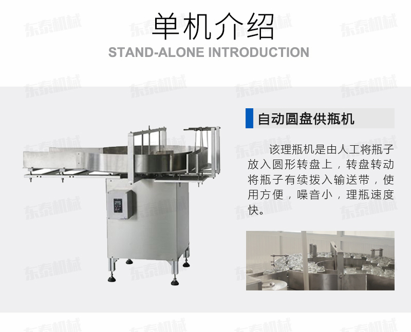 該理瓶機是由人工將瓶子放入圓形轉(zhuǎn)盤上,轉(zhuǎn)盤轉(zhuǎn)動將瓶子有續(xù)撥入輸送帶,進入灌裝機進行灌裝。使用方便,噪音小,理瓶速度快,操作簡單是不可缺少的一個環(huán)節(jié)。