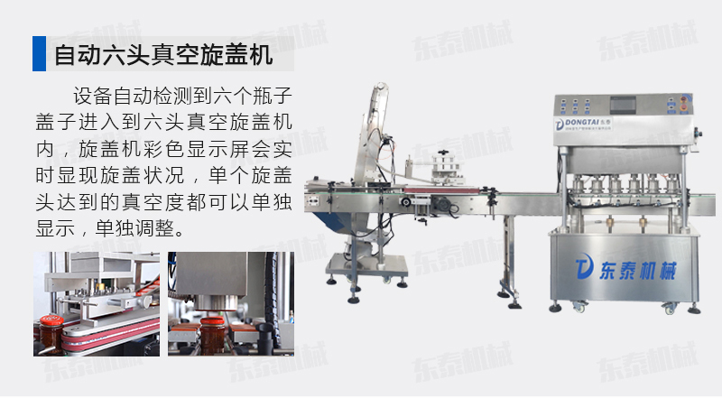該直線式真空旋蓋機是東泰機械結(jié)合用戶使用的情況,摒棄了傳統(tǒng)轉(zhuǎn)盤式真空旋蓋機的弊端,研制開發(fā)的設備,設備自動檢測到六個瓶子蓋子進入到六頭真空旋蓋機內(nèi),旋蓋機彩色顯示屏會實時顯現(xiàn)旋蓋狀況,整機多點檢測,當進口無瓶無蓋、出口堵塞、定位不準、瓶身傾倒均自動停機。單個旋蓋頭達到的真空度都可以單獨顯示,單獨調(diào)整!