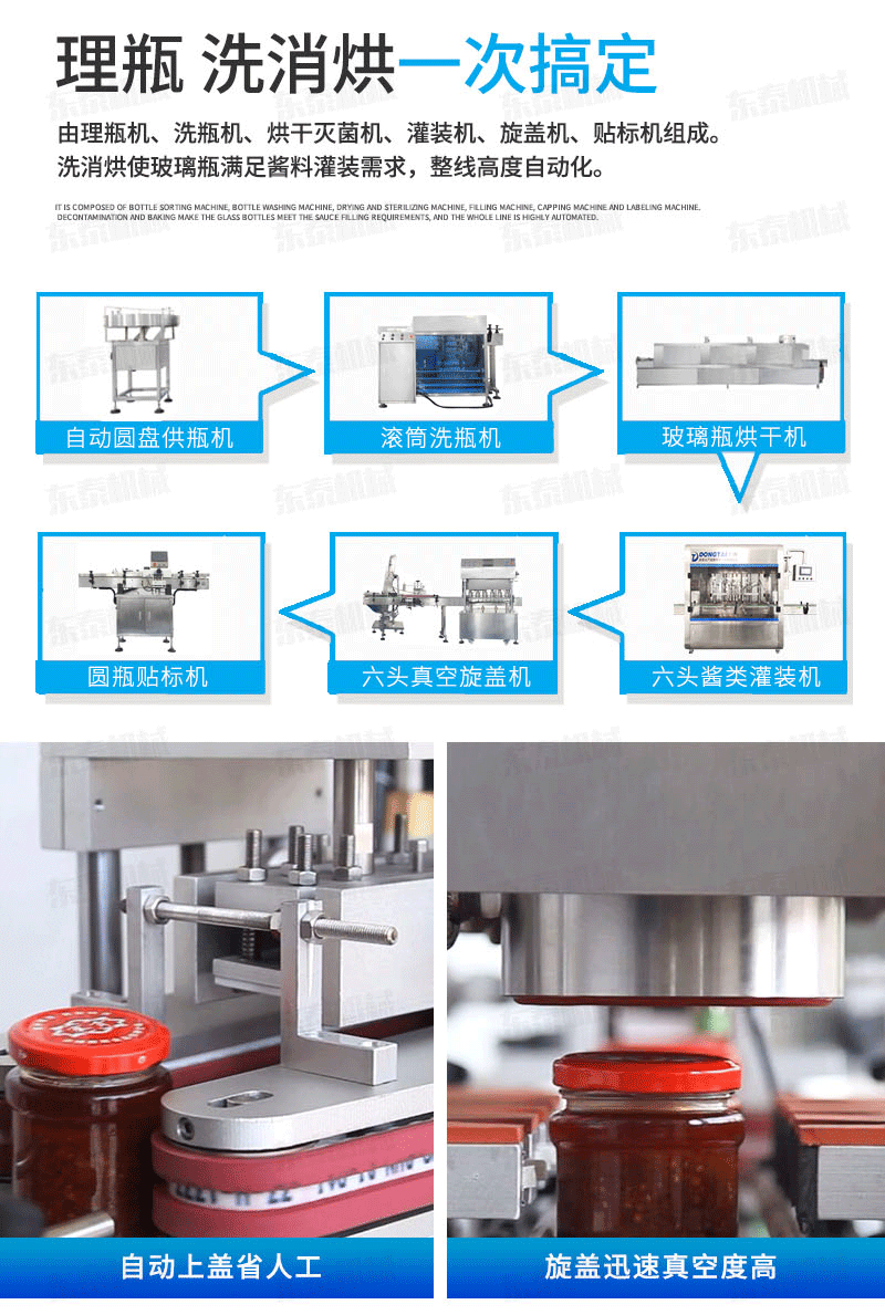 自動(dòng)供瓶機(jī)+全自動(dòng)滾筒洗瓶機(jī)+自動(dòng)六米烘干機(jī)+自動(dòng)收瓶機(jī)+全自動(dòng)六頭灌裝機(jī)自動(dòng)灌裝+全自動(dòng)提蓋機(jī)自動(dòng)理蓋、提蓋、掛蓋+六頭真空旋蓋機(jī)同時(shí)六個(gè)頭真空旋蓋+套標(biāo)機(jī)+收縮機(jī)+圓瓶貼標(biāo)機(jī)+整理平臺(tái);