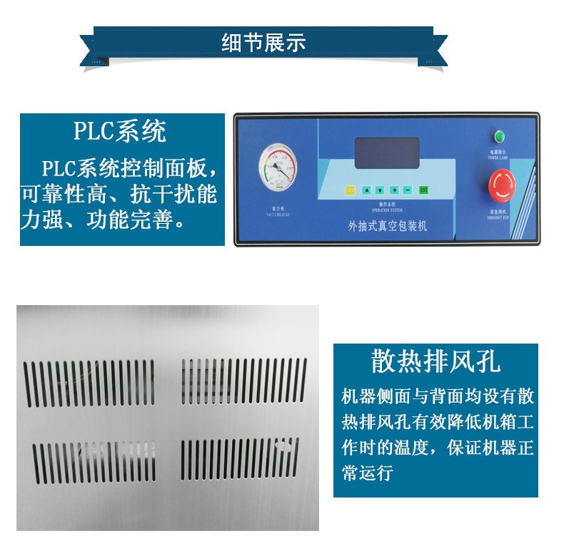 電源 220/50HZ  電機(jī)功率 0.36KW  熱封功率 0.95KW  抽氣速率 6.5m³/h  充氣速率