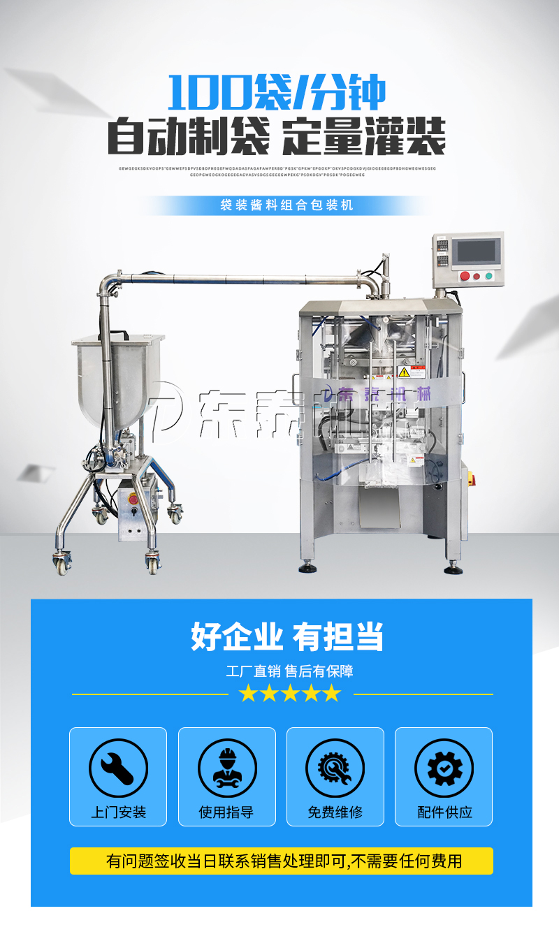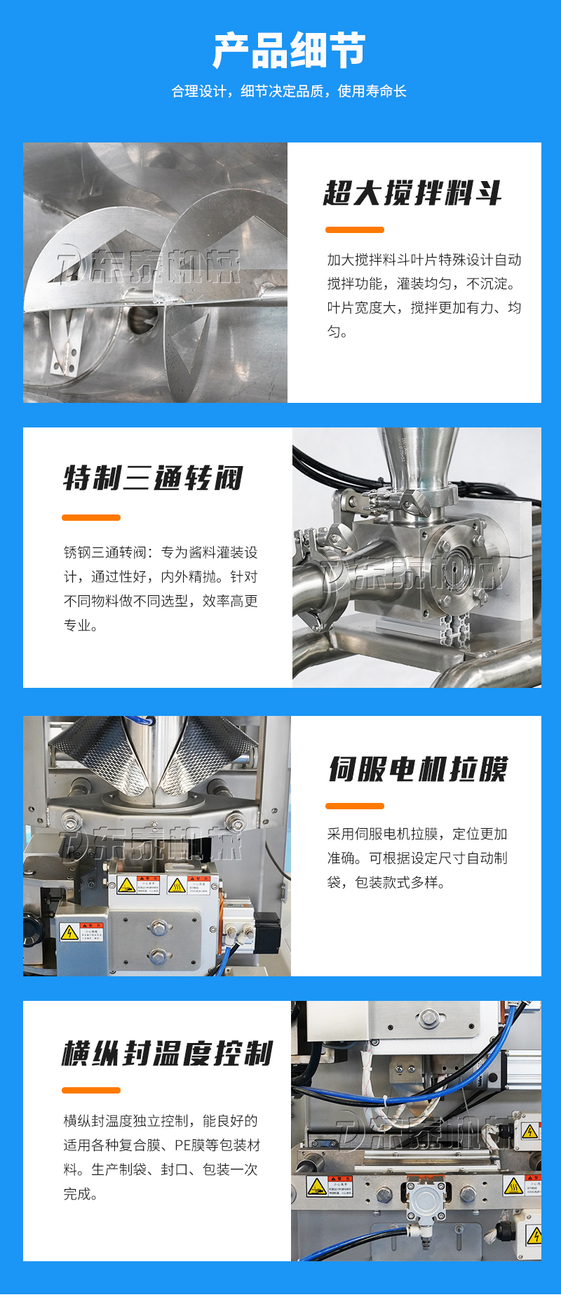 本機(jī)器主要用于調(diào)味品醬料的自動化包裝,機(jī)器安裝有橫向螺帶式攪拌,使油醬混合均勻,確保灌裝精度和產(chǎn)品包裝成品的均勻性。灌裝計量設(shè)備安裝有萬向輪,管路鏈接均采用快拆接頭,方便灌裝機(jī)拆卸移動清洗。包裝設(shè)備采