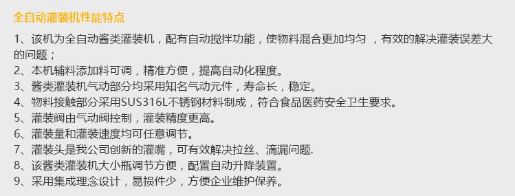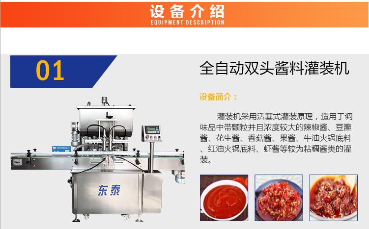 灌裝機(jī)采用活塞式灌裝原理,適用于調(diào)味品中帶顆粒并且濃度較大的辣椒醬、豆瓣醬、花生醬、香菇醬、果醬、牛油火鍋底料、紅油火鍋底料、蝦醬等較為粘稠醬類(lèi)的灌裝。