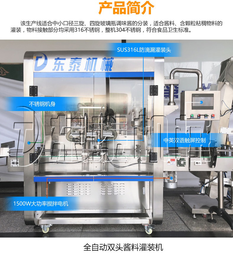 該機(jī)為全自動(dòng)醬類灌裝機(jī),配有自動(dòng)攪拌功能,使物料混合更加均勻 ,有效的解決灌裝誤差大的問題;本機(jī)輔料添加料可調(diào),精準(zhǔn)方便,提高自動(dòng)化程度。 醬類灌裝機(jī)氣動(dòng)部分均采用氣動(dòng)元件,壽命長,穩(wěn)定。 物料接觸部分采用SUS316L不銹鋼材料制成,符合食品醫(yī)藥安全衛(wèi)生要求。 灌裝閥由氣動(dòng)閥控制,灌裝精度更高。 灌裝量和灌裝速度均可任意調(diào)節(jié)。 灌裝頭是我公司創(chuàng)新的灌嘴,可有效解決拉絲、滴漏問題. 該醬類灌裝機(jī)大小瓶調(diào)節(jié)方便,配置自動(dòng)升降裝置。 采用集成理念設(shè)計(jì),易損件少,方便企業(yè)維護(hù)保養(yǎng)。 該全自動(dòng)醬類灌裝機(jī)設(shè)有無瓶不灌裝功能,不需更換零件,即可快速調(diào)整各種不同形狀規(guī)格的瓶子。